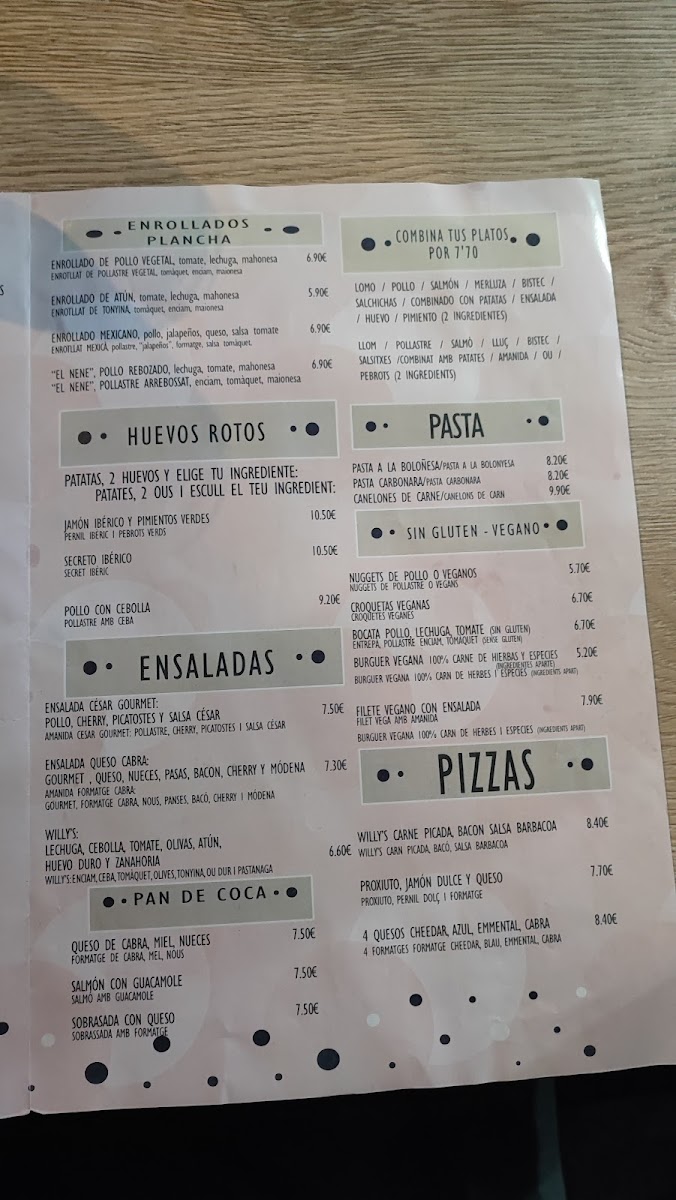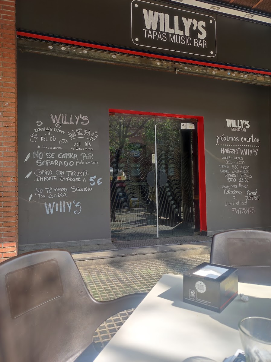 WILLYS DISCOBAR is a vibrant tapas bar, bar & grill, and night club located in the heart of Esplugues de Llobregat, Barcelona. The menu delivers authentic Spanish flavors with a modern twist, highlighted by crispy Tapas de Chocos (fried cuttlefish) and flavorful Saquitos de Queso de Cabra, blending tangy goat cheese with honey and fresh lettuce. Their Huevos Rotos are a must-try, especially the versions with tender chicken or rich Jamón Ibérico, paired with perfectly fried potatoes. For those avoiding gluten, the Bocata de Pollo con Lechuga y Tomate offers a tasty, safe option. The Patatas Bravas stand out with their classic spicy sauce, embodying tradition with a satisfying crunch. Friendly staff and lively ambiance complement the meal, creating an inviting locale for locals and visitors alike. WILLYS DISCOBAR skillfully balances authentic tastes with excellent value, making it a top choice for tapas lovers seeking genuine Spanish cuisine in a dynamic setting.